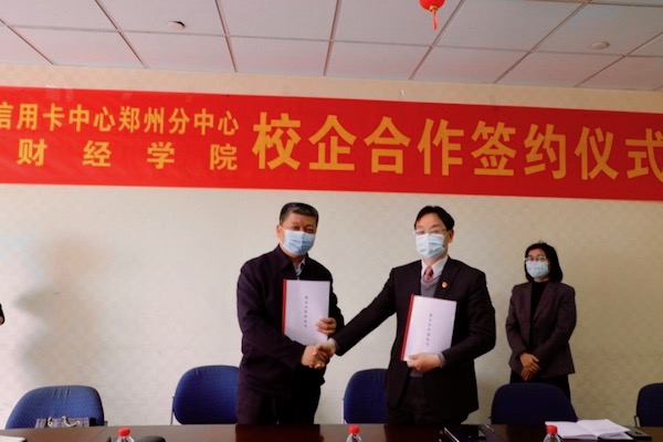 在热烈的掌声中,我校常务副校长李庆阳和广发银行信用卡中心郑州分中心总经理贠建礼作为校企双方代表签订了合作协议并合影留念。