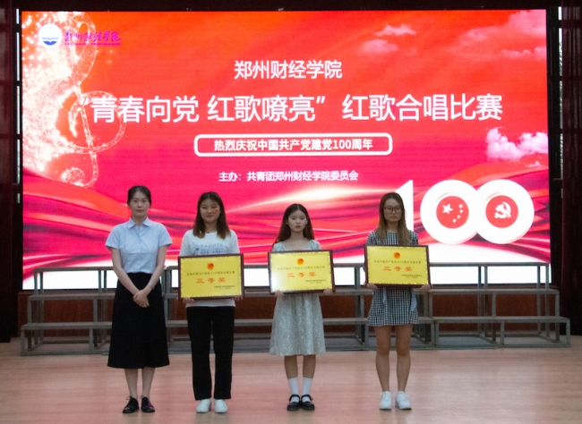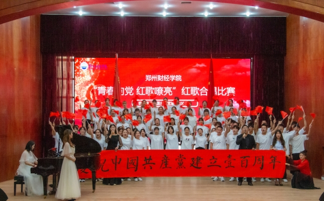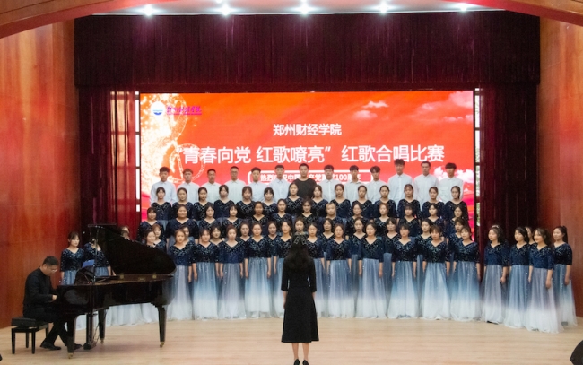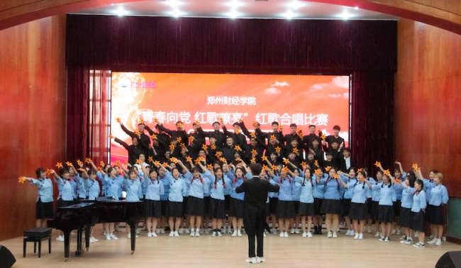 比赛现场,参赛队伍演唱了《没有共产党就没有新中国》《唱支山歌给党听》《红星歌》《五星红旗》《强军战歌》等一曲曲红色赞歌,时而深情追忆,时而激情澎湃,整个比赛现场精彩纷呈、高潮迭起,引得台下观众掌声不断。比赛不仅展现了郑财学子昂扬的精神风貌,更彰显了新时代青年青春心向党,以饱满的热情、执著的信念和过硬的本领,勇担中华民族伟大复兴历史重任的决心和信心。