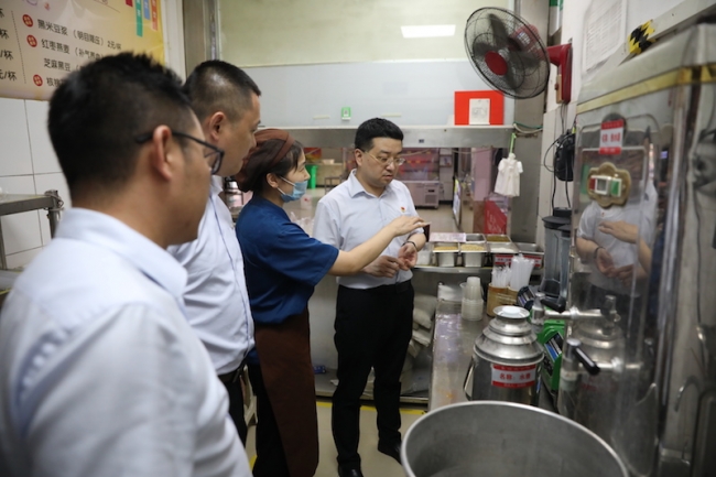牛钦民带队到行政楼检查消防设施配备、电器接线、茶水间路线等方面存在的安全隐患。李庆阳带队到实验楼,就用电线路、供电设施、配电间物品、安全通道等要害部位和重点场所进行了全面细致的检查。陈静、卢文邦带队前往宿舍楼就管线老化、违章电器使用、楼下停放“僵尸车”等情况进行了排查。李赞带队到食堂的重点区域、重点环节进行了严密排查,详细检查了煤气燃气设施、电线电路、配电盘及留样食品等安全及卫生状况。