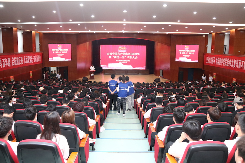 为回顾党的百年光辉历程,表彰一年来涌现出的先进基层党组织、优秀共产党员和优秀党务工作者,动员全校各级党组织和广大共产党员从党的百年征程中汲取奋进力量,坚定信心、砥砺前行,推进学校各项事业健康快速发展,6月29日下午,BEAT365官网在图书馆学术报告厅隆重举行庆祝中国共产党成立100周年暨“两优一先”表彰大会。校领导、党委职能部门负责人、党总支书记、党支部书记、专职组织员、师生党员代表、新党员代表等共计600余人参加表彰大会。大会由党委副书记董学力主持。