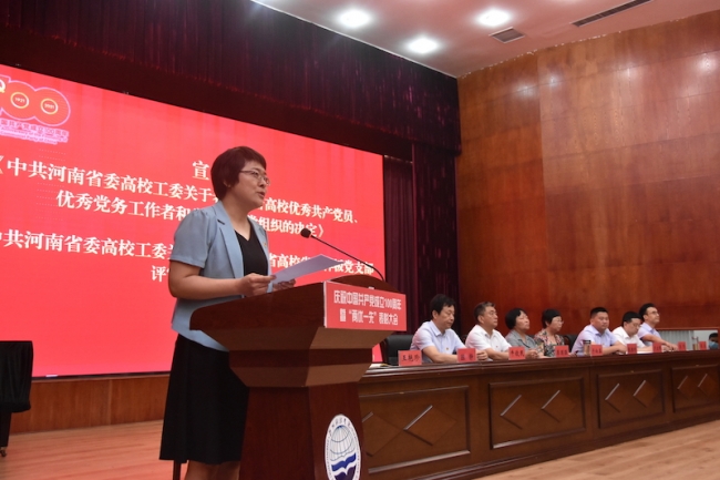 副校长陈静宣读了《中共河南省委高校工委关于表彰委管高校优秀共产党员、优秀党务工作者和先进基层党组织的决定》《中共河南省委高校工委关于公布首批全省高校省级样板党支部评审结果的通知》。