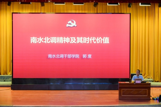 开班仪式后,南水北调干部学院培训联络部部长郭度以《南水北调精神及其时代价值》为题作报告。他从南水北调工程的概况、南水北调精神的内涵和南水北调精神的时代价值及弘扬三个方面展开阐述。郭度指出,南水北调精神的内涵主要包括:调水为民、治水兴邦的使命担当精神;南北统筹、经略江河的开拓创新精神;节水优先、绿色发展的科学求实精神;攻坚克难、戮力同心的拼搏奉献精神。郭度强调,新时代,在实现中华民族伟大复兴的关键时期,面对百年未有之大变局,弘扬南水北调精神具有极高的时代价值。可以帮我们进一步树牢宗旨观念;为我们进一步增强“四个自信”提供强有力的支持;为培育和践行社会主义核心价值观提供有效途径;为全面贯彻落实新发展理念提供鲜活生动的素材。
