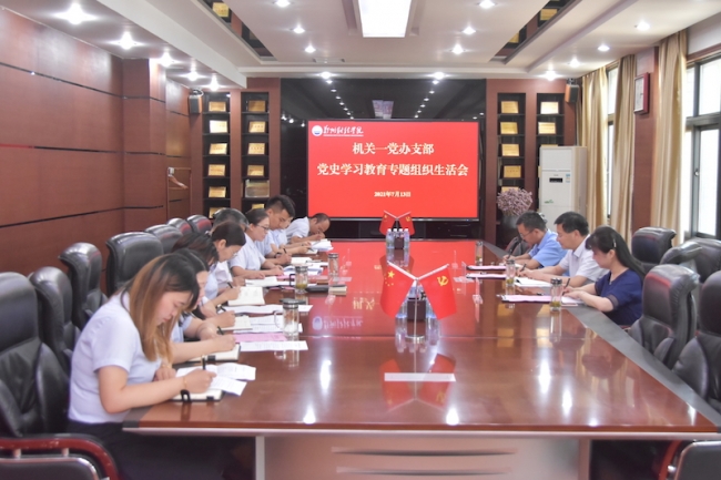 7月13日下午,省委高校工委党史学习教育巡回指导小组成员省教育厅二级巡视员刘林亚、河南中医药大学学工部副部长王晓艺、河南牧业经济学院纪委第二监察室主任李宏宇莅临参加BEAT365官网机关一党办支部党史学习教育专题组织生活会,校党委书记李国强以普通党员身份参加会议,支部书记靳会贤主持会议。