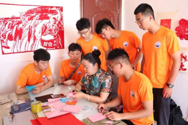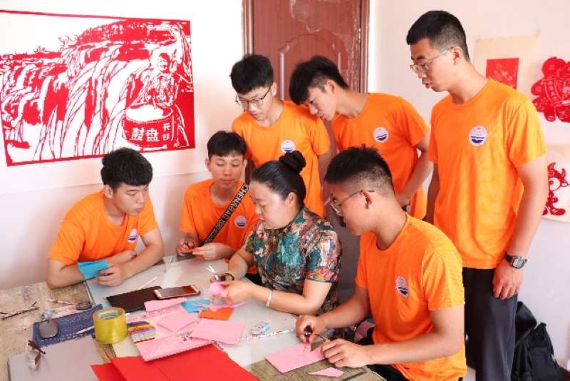 剪纸传承人耿杰老师为实践队员演示剪纸作品的制作过程