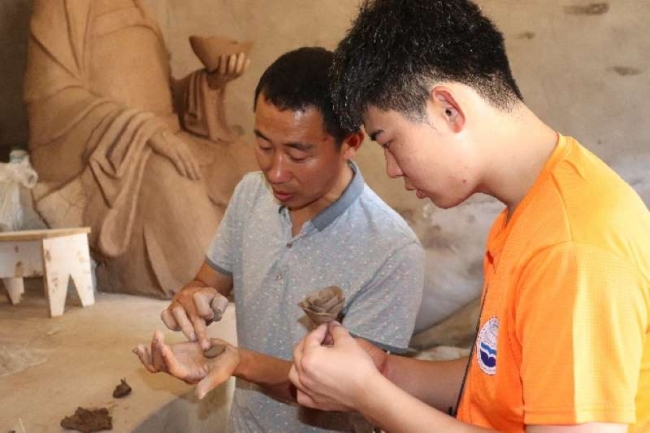 泥塑传承人汤义福老师教实践队员进行泥塑的制作