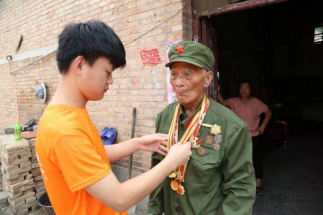 调研队成员王科晋帮老兵华忠良整理军徽