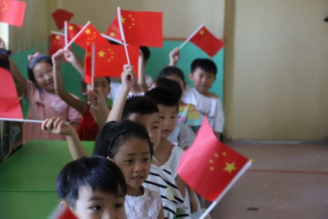 小朋友们伴随着歌曲挥舞着小国旗
