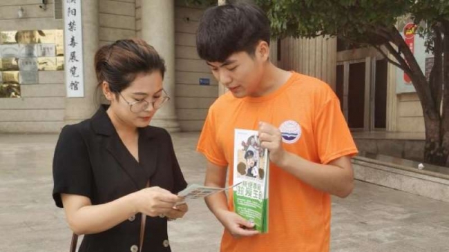 志愿者发放和讲解禁毒防艾宣传页
