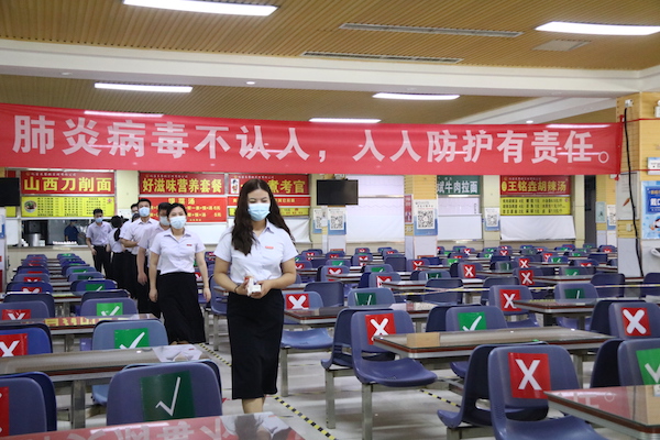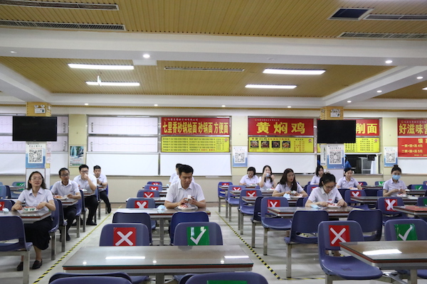 就餐时,师生需佩戴口罩,按照“七部洗手法”洗手后,在餐厅入口处有序排队等候体温检测。体温合格者进入餐厅,按照地面标识间隔一米以上排队买餐,可堂食或外带。餐厅就餐按照座位标识,单人单桌,同向就餐,避免交谈。就餐完毕后,须按照出口标识,迅速离开餐厅。体温异常者,由医护人员迅速带至临时留观区进行处置。