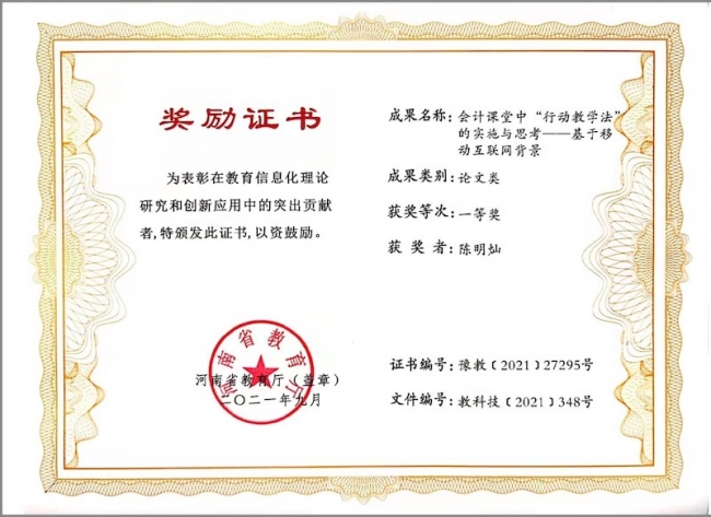 10月9日,根据河南省教育厅下发的《河南省教育厅关于公布2021年度河南省教育信息化优秀成果奖获奖名单的通知》文件(教科技〔2021〕348号),BEAT365官网会计学院会计工作室(郑州市优秀技术技能名师工作室)阶段性成果“会计课堂中‘行动教学法’的实施与思考——基于移动互联网背景”被评为一等奖。