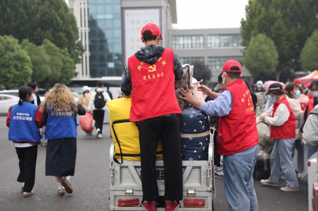 教育学院志愿者吴传玉说:“今天主要的工作就是迎接新生,我们不仅要帮助新生放置行李做好登记工作,带领新生进行报到,还要帮助他们把行李拿回宿舍。”问到她在这次志愿活动中最开心的事时,她说:“虽然搬运行李很累很辛苦,但是能够帮助到21级的学弟学妹们,自己就很开心,劳动最光荣!”