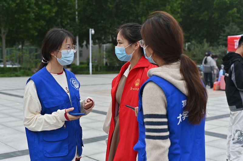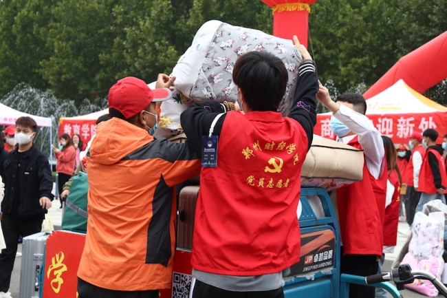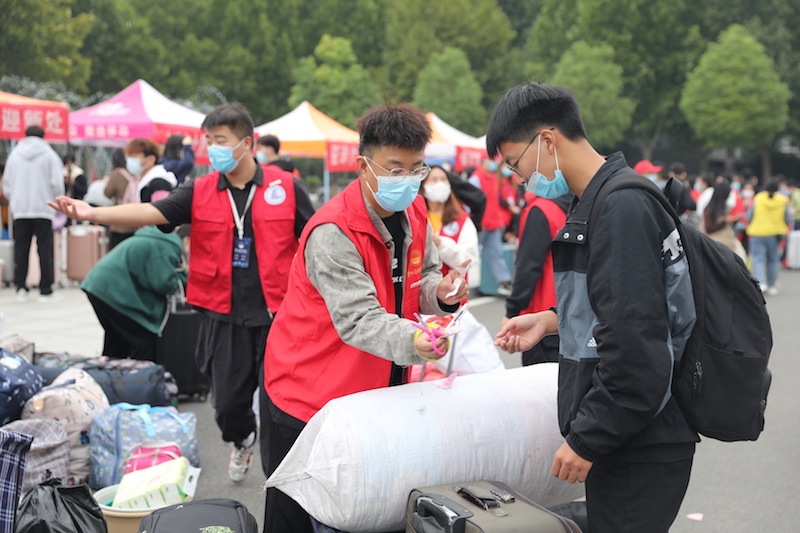 迎新现场,身着“红马甲”的志愿者们是校园里一道十分亮丽的风景线,他们穿梭于校园各处,全程用心呵护2021级的小萌新们。他们耐心地为新生答疑解惑,指导新生办理报到注册等入学手续,同时帮助其看管、运送行李,用细致周到的服务让新生一入校就感受到了如家的温暖。