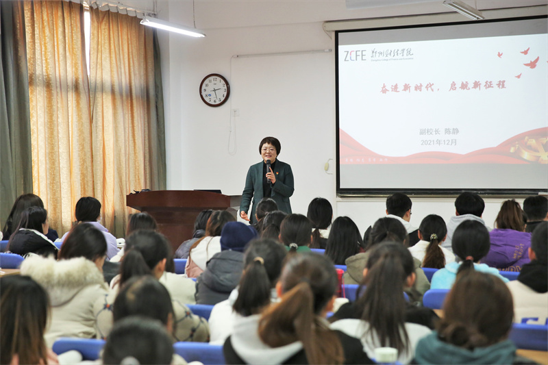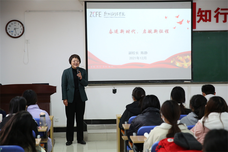 陈静以“辉煌中国”视频为切入点,讲述了当前我国整体发展状况,作为当今第二大世界经济体、最大工业国、最大货物贸易国和最大外汇储备国,已在多个领域走在世界前列。她从我国由“站起来、富起来、强起来”三个阶段讲述了中华民族进入新征程的光辉实践与探索过程,并结合自身多年工作经验和身边案例,鼓励郑财学子要有自己的梦想和追求,要坚定理想信念,立鸿鹄之志、练就过硬本领,修栋梁之才、勇担时代重任,显奋斗之为、努力奋进新时代、启航新征程。