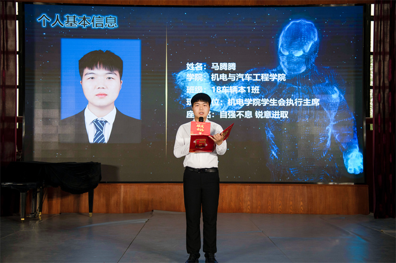 马腾腾连续两年担任智能工程学院学生会执行主席。作为一名学生干部,他始终坚持正确导向,把思想价值引领贯穿团队的各项工作,把坚持理想信念放在首位。带领学生会全面贯彻落实学校工作要点,通过开展“起航杯”篮球赛、趣味运动会等校园活动,丰富了学生的校园文化生活。在社会实践方面,他大力推动志愿服务全域化,积极组织青年志愿者走进社会,累计开展“最美风景线”等30余次活动,进一步塑造了青年团员勇于实践、无私奉献的精神。