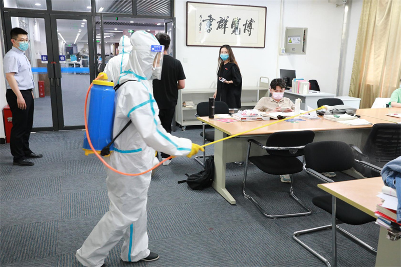 学校紧急启动应急预案实施全面封闭管理后,实验室管理处工作人员和物业保洁人员积极响应号召,于5月3日晚连夜返校驻守实验室。为了更好地保障实验室安全,实验室管理处在校人员及物业保洁人员每日三次对各个实验室、实验楼走廊、连廊、卫生间和办公室进行无死角、全覆盖消杀,彻底切断病毒传播。在完成消杀工作后,在校人员继续正常工作。