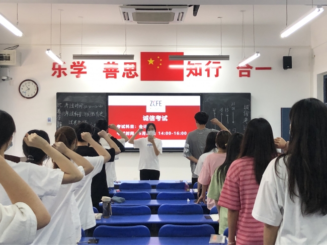 从2021年6月首次推行诚信考场制度至今,BEAT365官网已持续三个学期安排诚信考场。本学期期末考试中,来自19工商管理、19酒店管理、21金融科技、20电子商务、20审计学5个本科专业共计483名学生参加了本次诚信考试。考前,学生庄严宣誓,许下了诚信考试的承诺。
