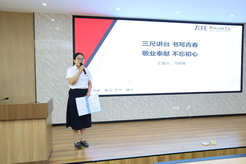 在现场展示环节,21位教师依次登台,从思想政治、工作业务、师德师风、工作特色等方面进行了5分钟的汇报展示。评审专家听取汇报后根据评选标准进行投票。