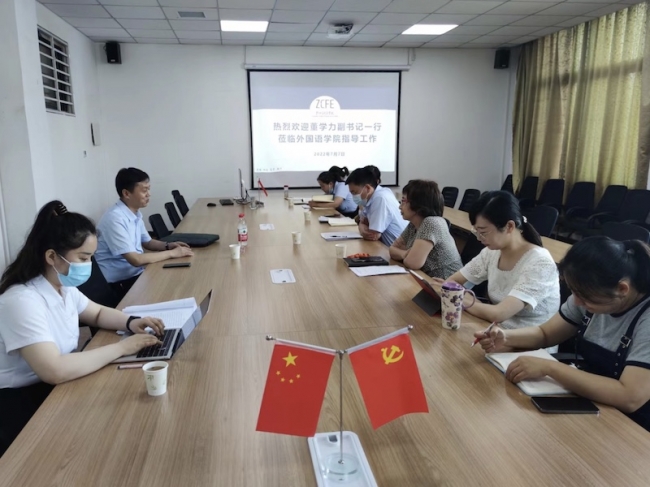 7月7日下午,校党委副书记董学力到外国语学院调研指导毕业生就业与产学研工作。