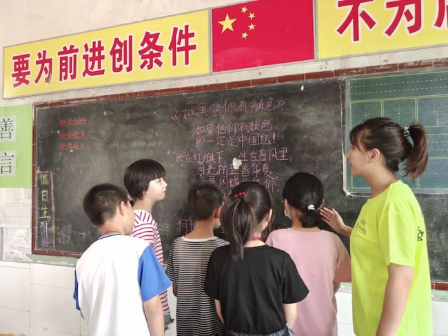 支教团队员带领学生朗读红色诗歌《如果信仰有颜色》
