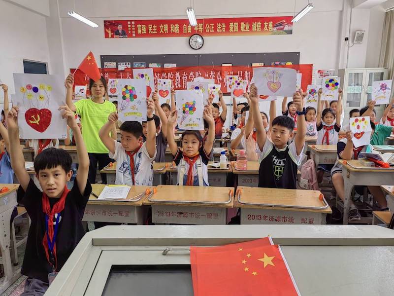 青少年正处于世界观、人生观、价值观形成的关键时期,强化党史学习教育对于广大青年坚定信心,跟党走、跟党走具有重要意义。支教期间,支教队员通过开展红色文化参观、党史小课堂、红色观影、红色故事分享会、红色歌曲演唱、庆“七一”手工制作活动、党史黑板报等,结合当地发生的红色故事、走访老党员,引导学生追忆往昔峥嵘岁月,赓续红色血脉,厚植爱国情怀,勇担时代使命。