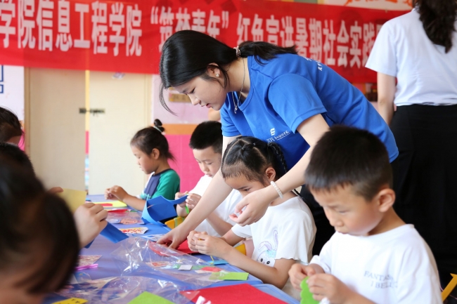 信息工程学院“筑梦青年”暑期社会实践团成员教小朋友们做手工