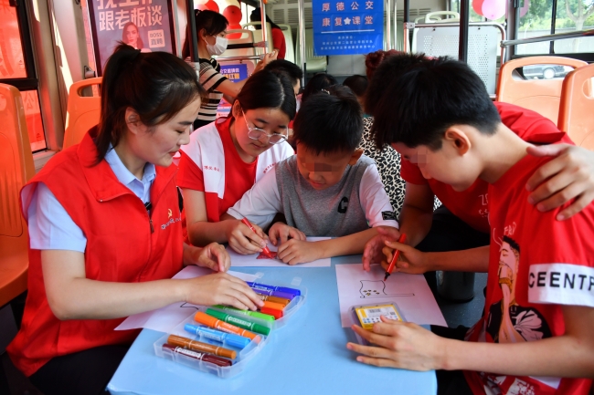 艺术设计学院“艺起益行”关爱自闭儿童暑期社会实践团成员和星星小朋友一起画国旗党旗