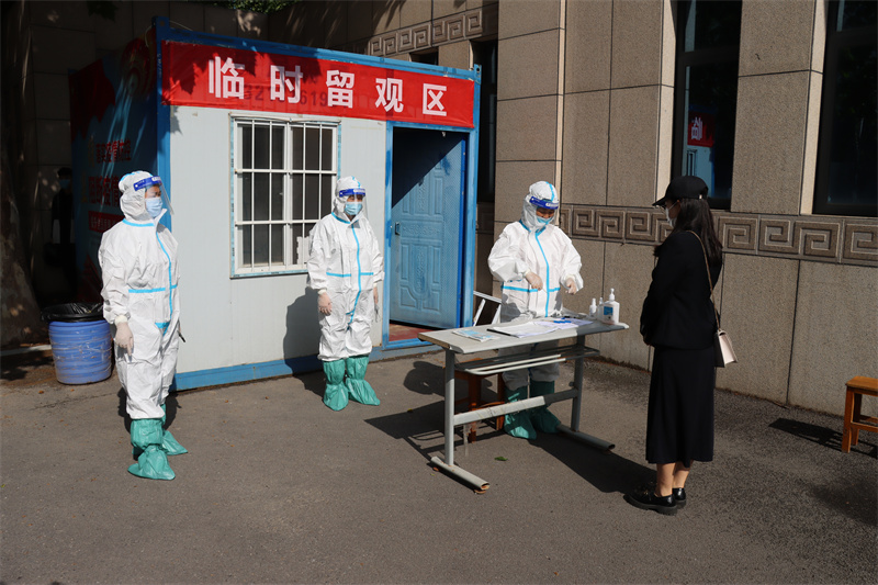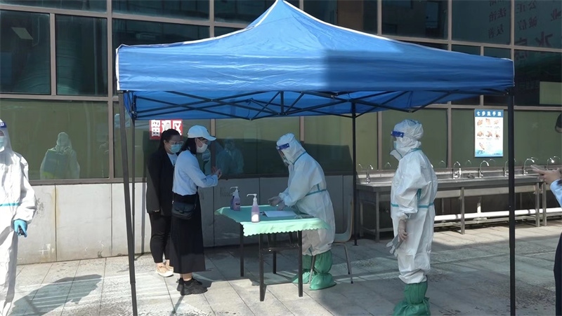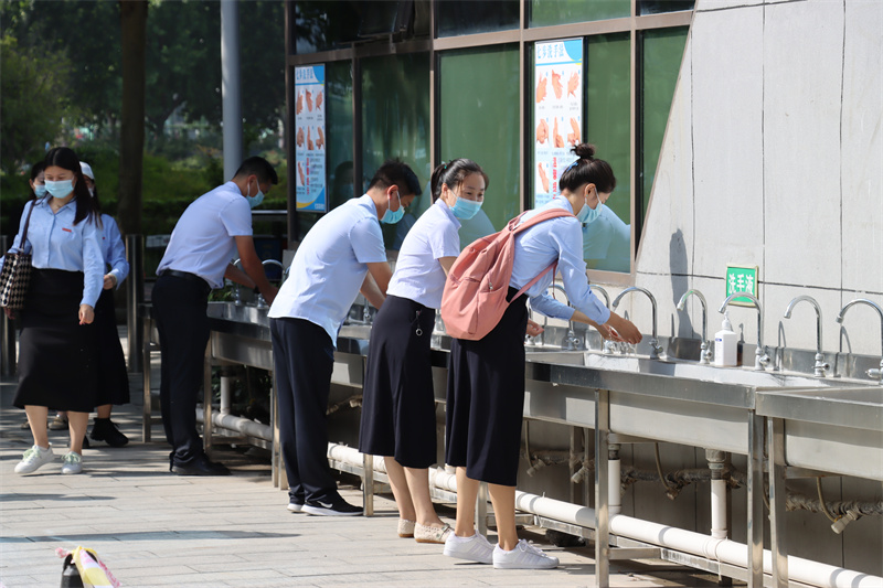 根据秋季返校开学疫情防控演练安排,此次演练在学校南门、2号教学楼、学生餐厅、15号学生宿舍楼四个重点场所进行。各演练场所分别对模拟发热或作为确诊病例密切接触者两种情况进行了实战演练。演练前,各场所疫情防控工作人员周密部署,细化流程,根据可能遇到的各类情况制定演练脚本。演练现场,根据教职工模拟情况,迅速启动疫情防控应急预案,学校疫情防控工作领导小组、疫情防控工作专班、校医务室等多部门有效联动,密切配合,参演教师按照应急演练路线和要求,在较短的时间内高效、熟练地演示了各场景下的疫情防控要求和应急处置流程。