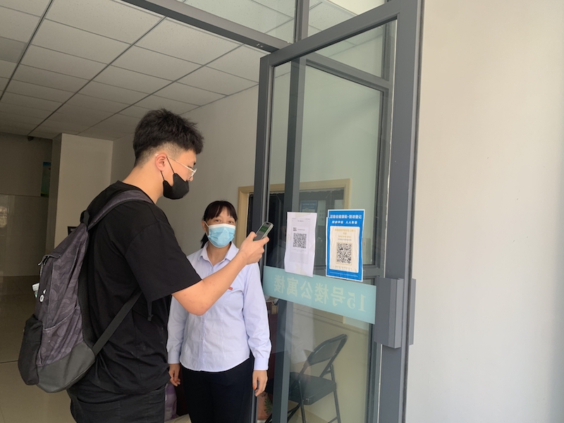新生在宿舍门口扫描场所码