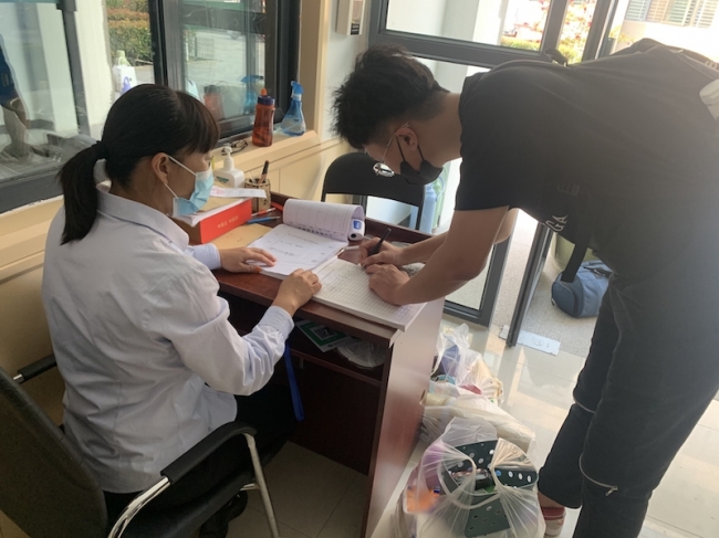 新生到达宿舍楼后,在宿舍门口划定区域内间隔1米距离排队,扫描场所码,再次进行体温测量、行李消杀。核查无误后,经过登记学生方可进入宿舍楼。