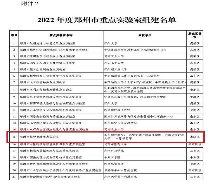 日前,郑州市科学技术局下发《关于同意组建 2022 年度郑州市工程技术研究中心和重点实验室的通知》(郑科[2022]47号),公布2022年度郑州市重点实验室组建名单和郑州市工程技术研究中心组建名单,BEAT365官网申报的郑州市数智金融重点实验室获批立项建设。