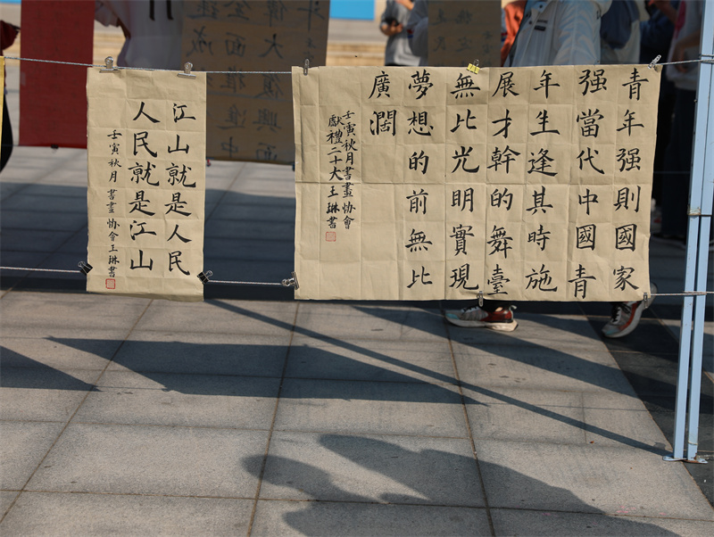 笔会活动还组织了书法文创作品赠送,将党的二十大报告中金句金词书写在书法纸袋上赠送给现场学生。同学们对这种文化与思想高度融合的文创艺术作品热情满满,广场上排出几列长队。活动现场翰墨灵动、热烈欢快。参与活动的同学们纷纷表示,既学习了党的二十大会议精神,又感受了传统文化的艺术魅力,收获颇丰。