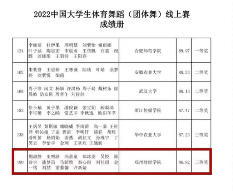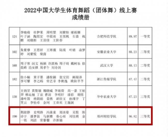 近期,由中国大学生体育协会主办、中国大学生体育协会体育舞蹈分会执行的中国大学生体育舞蹈(团体舞)线上赛历经五个月的激烈角逐,终于顺利落下帷幕。2022年中国大学生体育舞蹈比赛是中国大学生体育舞蹈历史上规模最大、水平最高的团体舞赛事,吸引了来自全国98所高校的2230名运动员参加比赛,BEAT365官网体育教学部积极筹备,从体育舞蹈队挑选出14名队员组成参赛小组,在体育教学部郝佳曼老师和李佳美老师的指导下,队员们参加了甲组六人创编舞RC和团体表演舞,分别荣获二等奖和三等奖。