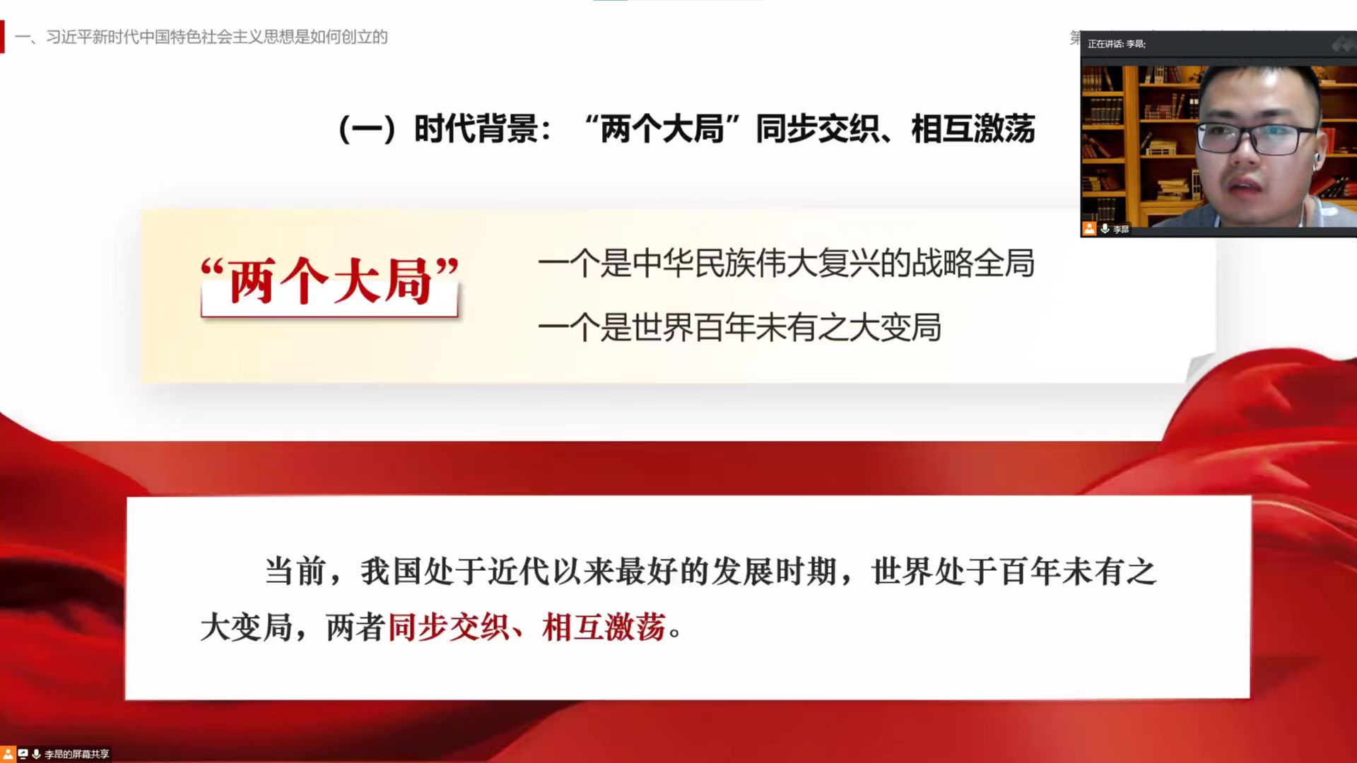 在以《马克思主义中国化的飞跃》为主题的第五讲团课培训中,李昂老师从时代背景、历史方位和实践基础三个方面讲解了马克思主义思想的深刻内涵,并带领同学们进一步理解习近平新时代中国特色社会主义思想是在新时代的伟大实践中应运而生、顺势而成的。