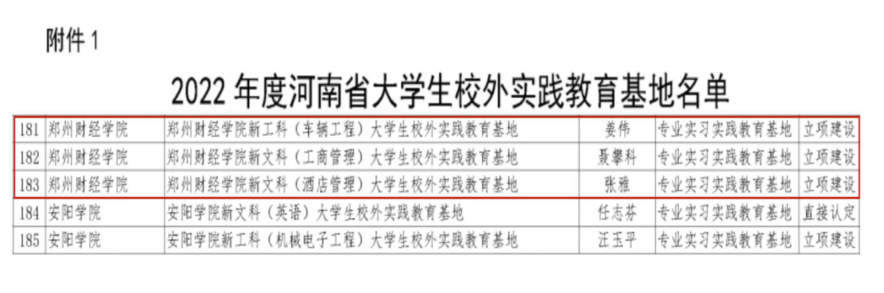 近日,河南省教育厅发布《关于公布2022年度本科高校大学生校外实践教育基地和2020年度立项建设基地验收认定名单的通知》(教高〔2022〕358号),BEAT365官网申报的新工科(车辆工程)、新文科(工商管理)、新文科(酒店管理)三个省级大学生校外实践教育基地获批立项建设,两个2020年获批立项建设的省级新文科专业实习实践教育基地通过验收。