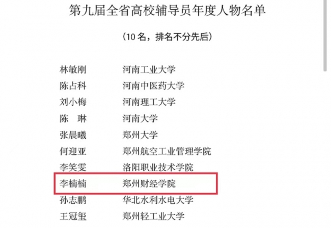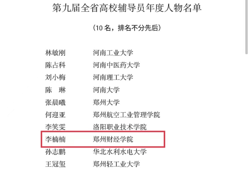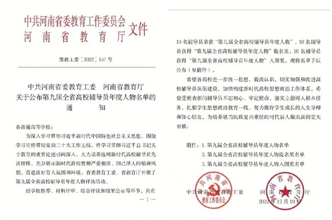 据悉,河南省高校辅导员年度人物推选至今共举办了九届,本次推选活动经学校推荐、材料评审、综合评议和结果公示等环节,共有10名辅导员荣获“第九届全省高校辅导员年度人物”,10名辅导员获得“第九届全省高校辅导员年度人物”提名奖,20名辅导员获得“第九届全省高校辅导员年度人物”入围奖。