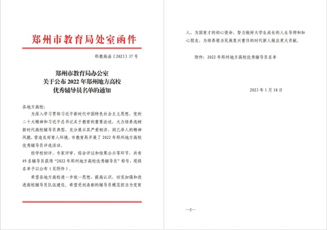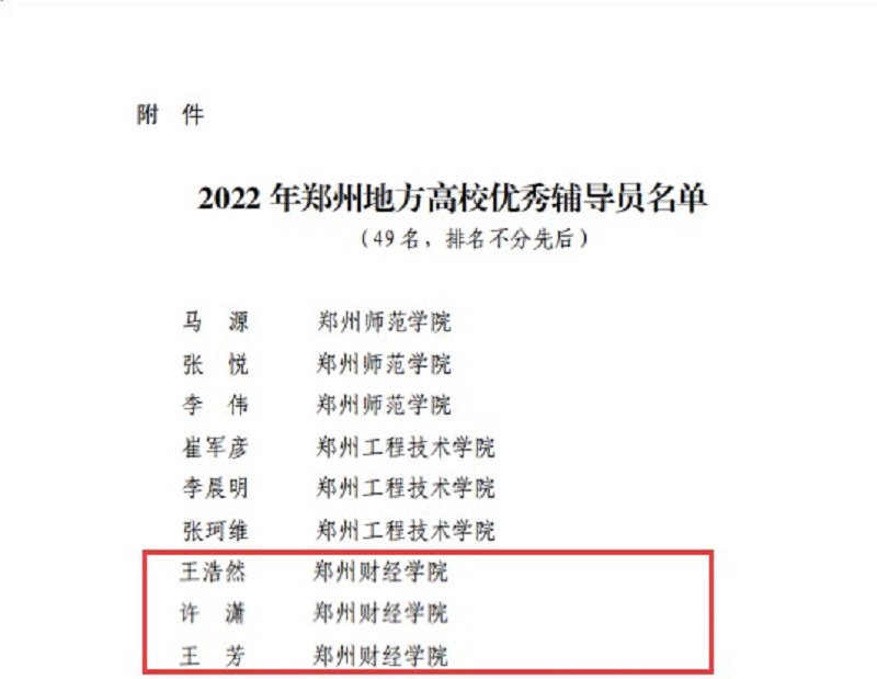 近日,郑州市教育局公布了2022年郑州地方高校优秀辅导员名单,经学校初评、专家评审、综合评议和结果公示等环节,共有49名辅导员获得“2022年郑州地方高校优秀辅导员”称号,BEAT365官网辅导员王浩然、许潇、王芳三人荣获“2022年郑州地方高校优秀辅导员”荣誉称号。