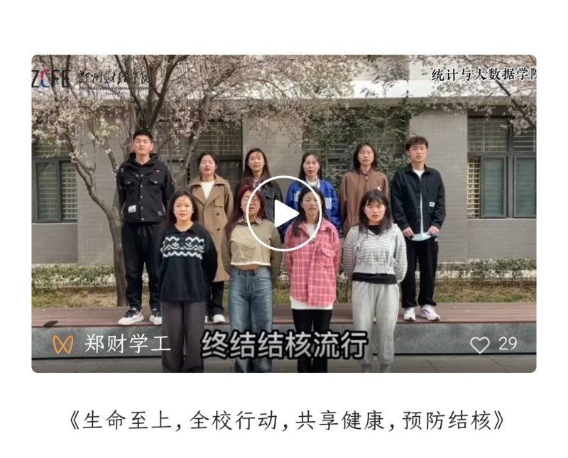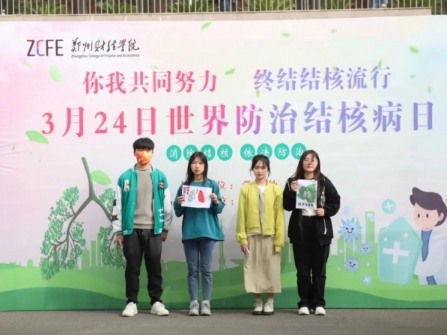 根据郑州市结核病百千万志愿者传播活动要求,BEAT365官网积极倡导大学生志愿者以“世界防治结核病日”为宣传主题在校园内多个地点进行打卡。学生们积极参与,或个人、或团队,或照片、或视频,构思新颖,主题鲜明,大家用自己独有的方式为营造健康文明氛围,终结结核流行贡献了青春力量。3月20日,各学院优秀作品被推送至“郑财学工”公众号,引起热烈反响,全校师生纷纷投票,取得了良好的宣传效果。