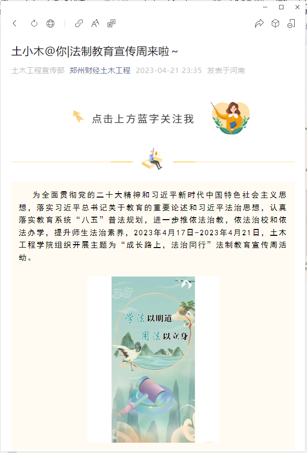 为教育引导学生人人知法、人人守法,牢固树立法治观念,切实提升师生法治意识和法治素养,围绕“成长路上 法治同行”组织开展征文活动。活动期间,各学院广泛动员,引导学生自主查阅资料文献,学习法律法规及法治社会建设相关内容,结合新时代大学生的使命与职责,深入思考,积极创作。