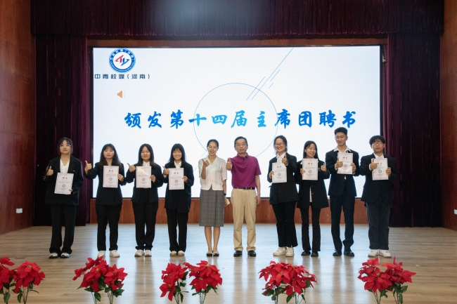 中青校媒(河南)秘书长潘志贤老师为第十四届主席团颁发聘书,并由第十四届主席团为第十五届主席团授旗。第十五届主席团代表侯瑞雨发表就职宣言。最后,潘志贤老师做年会总结,宣布中青校媒(河南)年会暨第十五届主席团换届大会圆满完成。