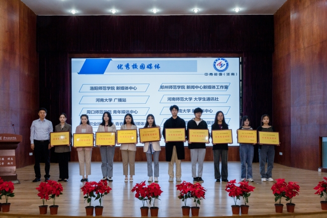 在颁奖环节,主席台就座的领导、嘉宾和老师分别为2022-2023年度河南省“年度影响力校媒”,2022—2023年度河南省“最具潜力校媒”、“最具人气校媒”,2022—2023年度河南省“优秀校园媒体”,优秀指导老师、优秀校媒人的获奖单位及个人颁奖。