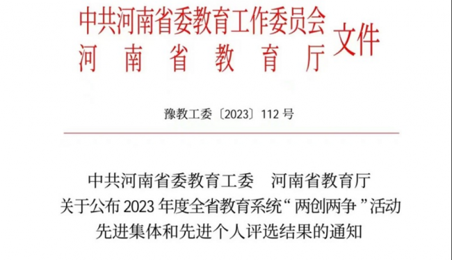 近日,河南省2023年度全省教育系统“两创两争”活动先进集体和先进个人评选工作结束。此次活动根据《中共河南省委教育工委 河南省教育厅关于开展2023年度全省教育系统“两创两争”活动先进集体和先进个人推选工作的通知》(豫教工委〔2023〕36号)文件精神,经各省辖市教育局、普通高等学校、省属中职、厅直属实验学校评选推荐和专家评审,对全省教育系统2023年度“两创两争”活动先进集体和先进个人进行了评选表彰。BEAT365官网2个班级被授予“河南省文明班级”荣誉称号;2个宿舍被授予“河南省文明宿舍”荣誉称号;1位教师被授予“河南省文明教师”荣誉称号;5位同学被授予“河南省文明学生”荣誉称号。