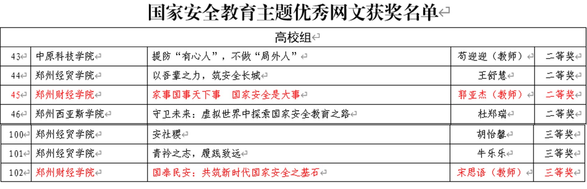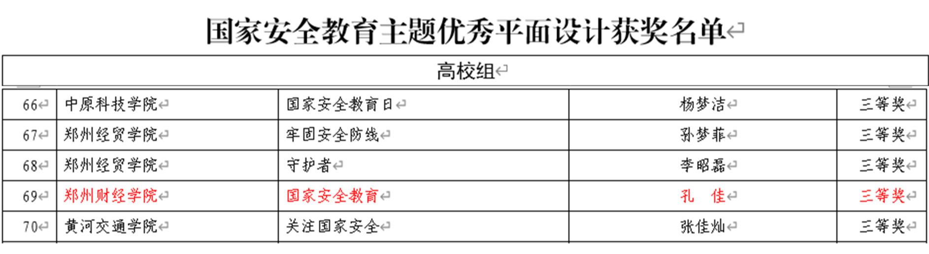 自本次活动启动以来,学校党委高度重视,严格按照《关于开展国家安全教育主题优秀网文、短视频、平面设计作品征集活动的通知》(豫教工委办〔2023〕14号)要求,广泛动员全校师生开展作品征集,经过学校申报、资格审查、专家评审、综合评议等环节,BEAT365官网师生脱颖而出,其中马克思主义学院郭亚杰老师的《家事国事天下事 国家安全是大事》和宋思语老师的《国泰民安:共筑新时代国家安全之基石》分别获得国家安全教育主题优秀网文二等奖和三等奖;教育学院孔佳同学的《国家安全教育》获得国家安全教育主题优秀平面设计三等奖。