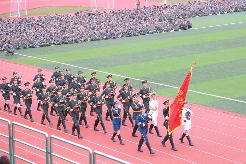上午9点整,新生军训汇报表演在庄严的国歌声中拉开了序幕。