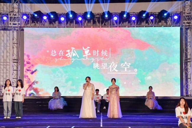 夜色渐暗,光影交错,晚会在合唱曲目《追光者》中拉开序幕,曲调唯美舒缓,温暖治愈,歌词情真意切,直戳心意,演唱者用干净悠扬的嗓音,表达了对梦想的执着,让青年学生坚定了未来四年仰望星空、脚踏实地、不断追光的信念。