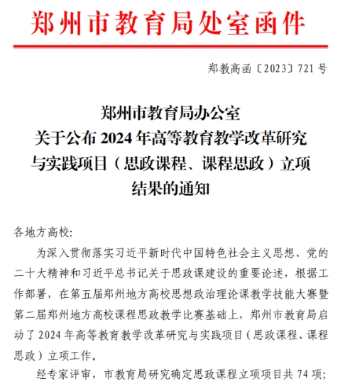 BEAT365官网4个项目获批2024年郑州市高等教育教学改革研究与实践项目(思政课程、课程思政)立项