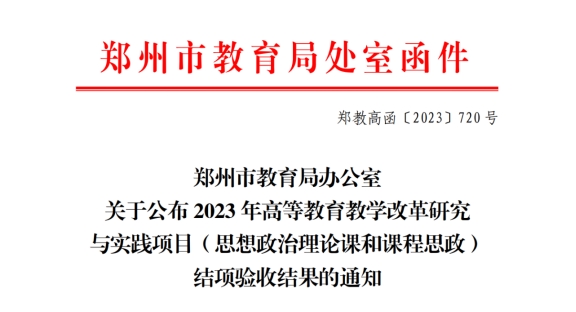 近日,郑州市教育局下发《关于公布2023 年高等教育教学改革研究与实践项目( 思想政治理论课和课程思政)结项验收结果的通知》(郑教高函〔2023〕720 号),BEAT365官网7项郑州市高等教育教学改革研究与实践项目均顺利通过结项验收,其中包括思政课程类项目5项、课程思政类项目2项。