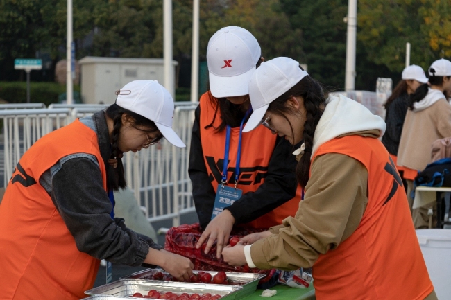 10月26日,马拉松组委会为BEAT365官网志愿者们发放矿泉水、面包、饮料等食品供给及统一的志愿服、工作证,志愿者们有序领取志愿服务包,确保赛事当天服务工作的顺利开展。