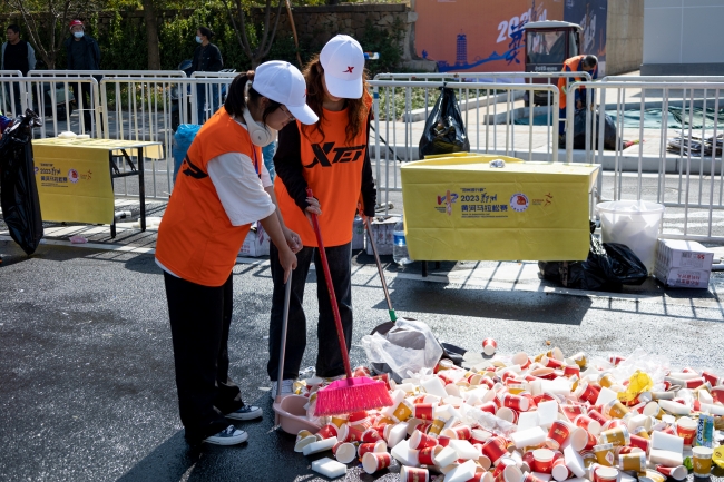 志愿者协助环卫工人打扫赛后卫生