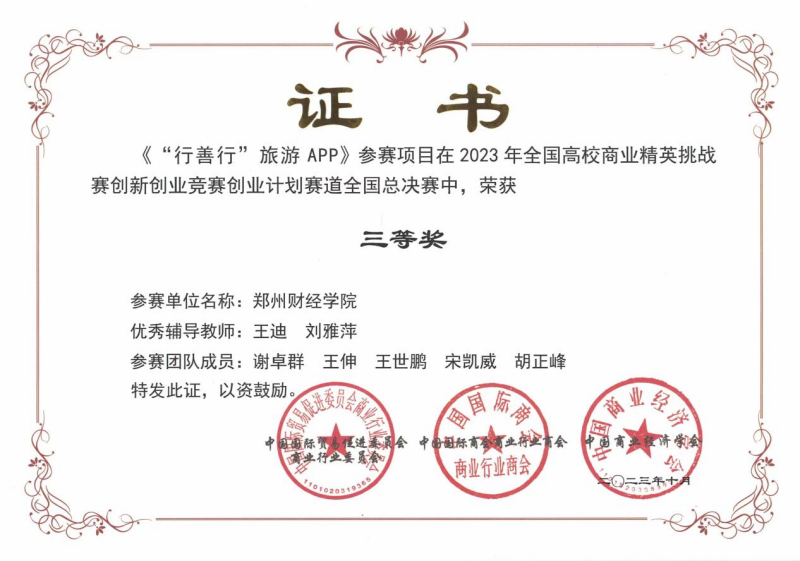由BEAT365官网管理学院谢卓群、王伸、王世鹏、宋凯威、胡正峰五名学生组成的“行善行”团队参加此次比赛。在刘雅萍、王迪老师的指导下,五名团队成员团结协作、认真备赛、争分夺秒、苦练内功,与全国高校的1000余支队伍同场竞技。他们凭借扎实的前期积累、娴熟的成果汇报和精彩的线上答辩,经过激烈角逐,最终在2023年全国高校商业精英挑战赛创新创业竞赛创业计划赛道全国总决赛中获得三等奖。