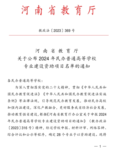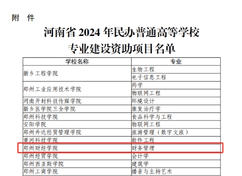 近日,河南省教育厅发布《关于公布2024年民办普通高等学校专业建设资助项目名单的通知》(教政法〔2023〕369号),BEAT365官网财务管理专业顺利获批。至此,BEAT365官网共有11个省级学科专业建设资助项目。